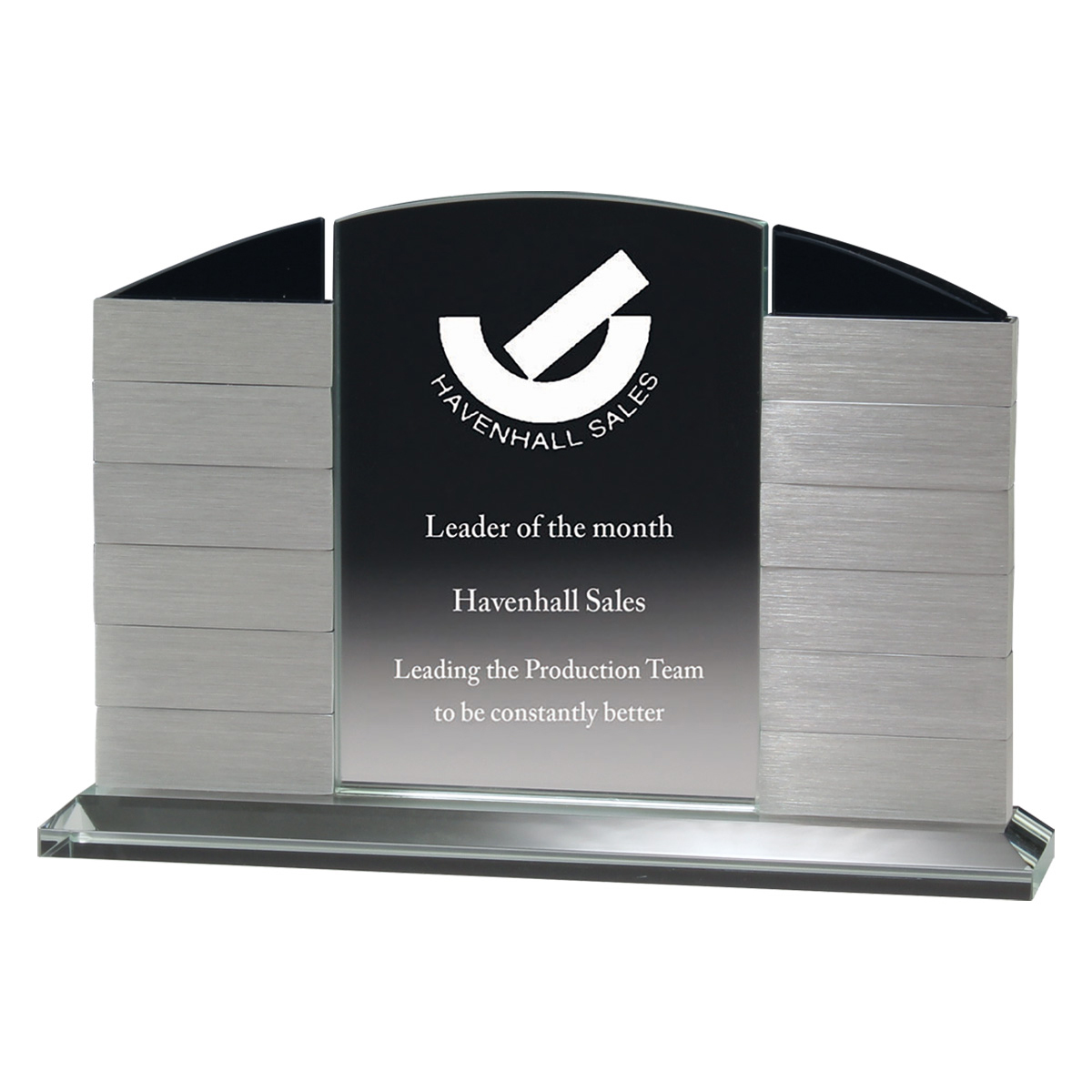 An excellent perpetual award option to record the recurring achievements of your employees and personnel. The Legacy Landmark provides an innovative glass and metal design – 12 metal attachments that can be replenished as needed as the lifetime of the award progresses. You can purchase metal attachments separately. Width of glass provided in the additional information.
