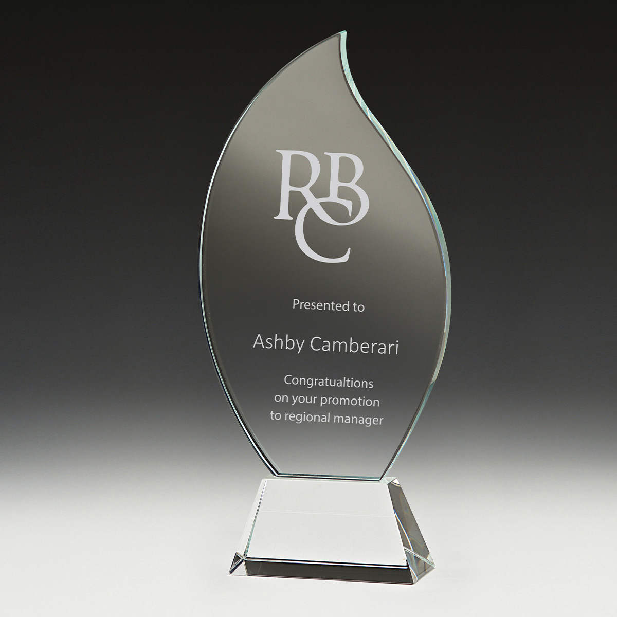 The Levity series of clear glass awards features a unique flame inspired design symbolic of achievement & success.