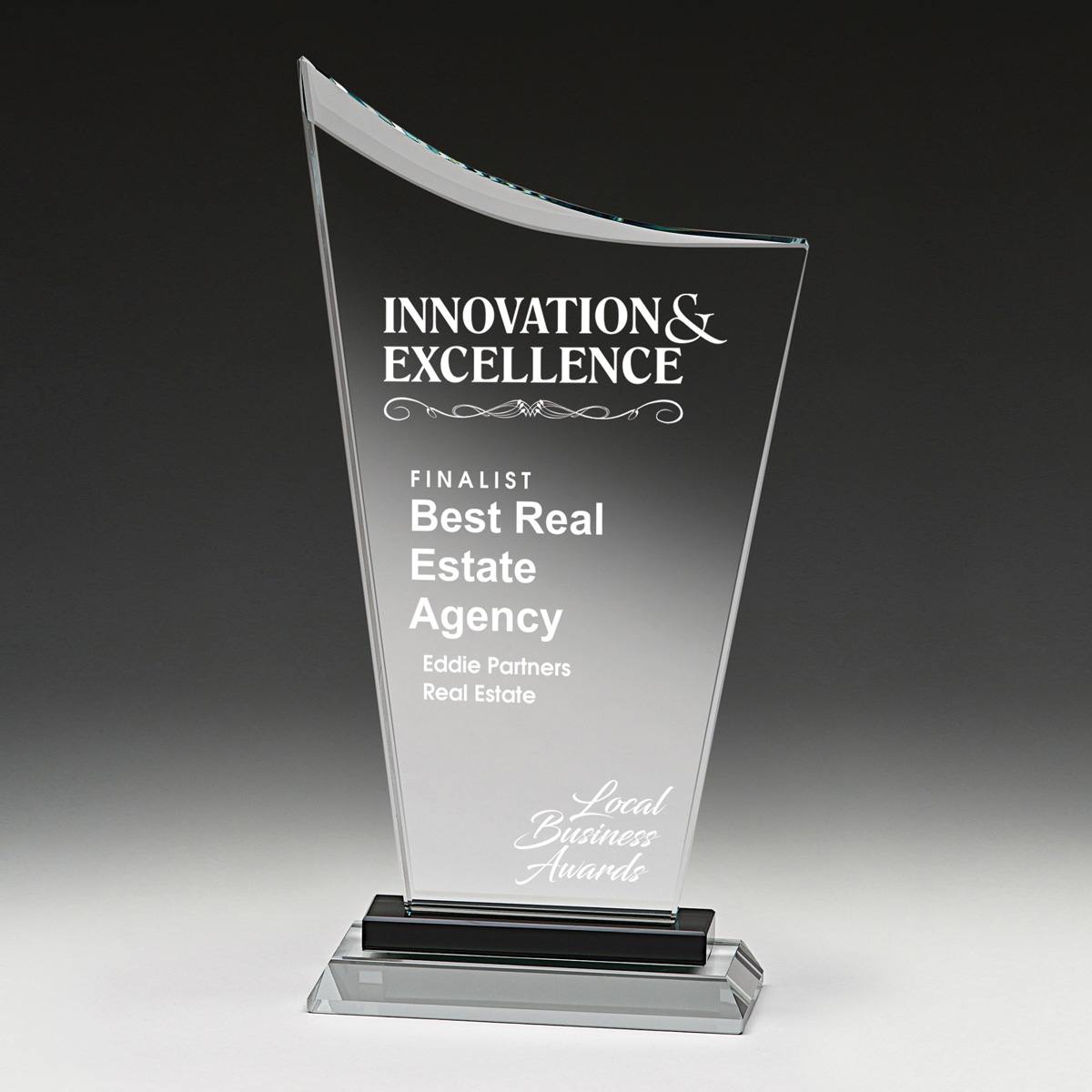 Distinctive shaped glass emblematic of achievement, the Sabre series presents ample space for personalisation. Awards are available in multiple sizes and in presentation boxes.