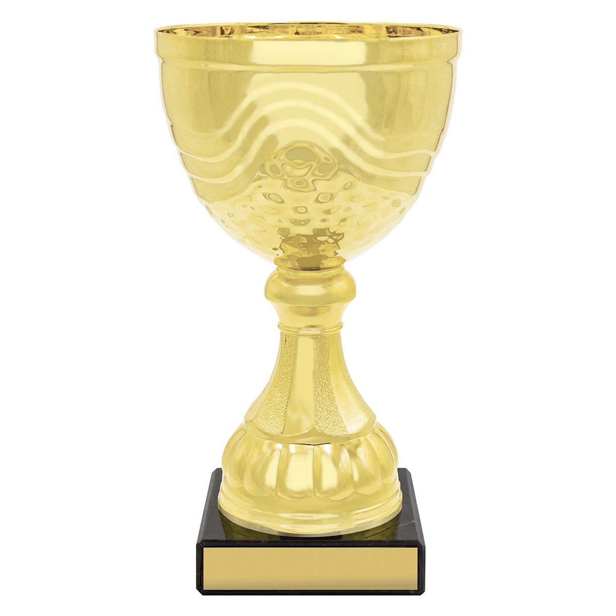 Versatile trophy cup design well suited to range of events and presentations. Gold metal bowls with prestige black marble bases. Lids to suit.