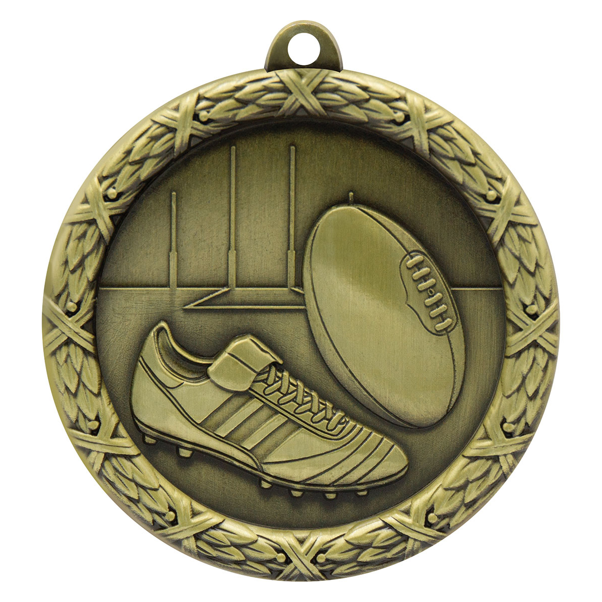 Traditional wreath style medal offers a sizable medal at excellent value. Finished in classic antique gold. Large area on back of the medal for engraving.