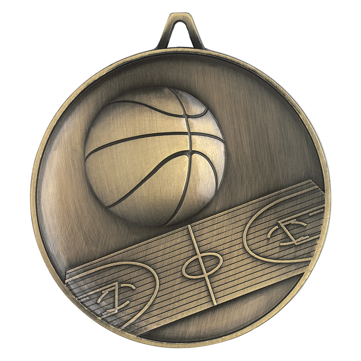 The Budget Heavyweight series offers prestige antique gold medals for a range of sports and activities at great value. The Basketball medal features an abstract ball inspired design with detailed court foreground.
