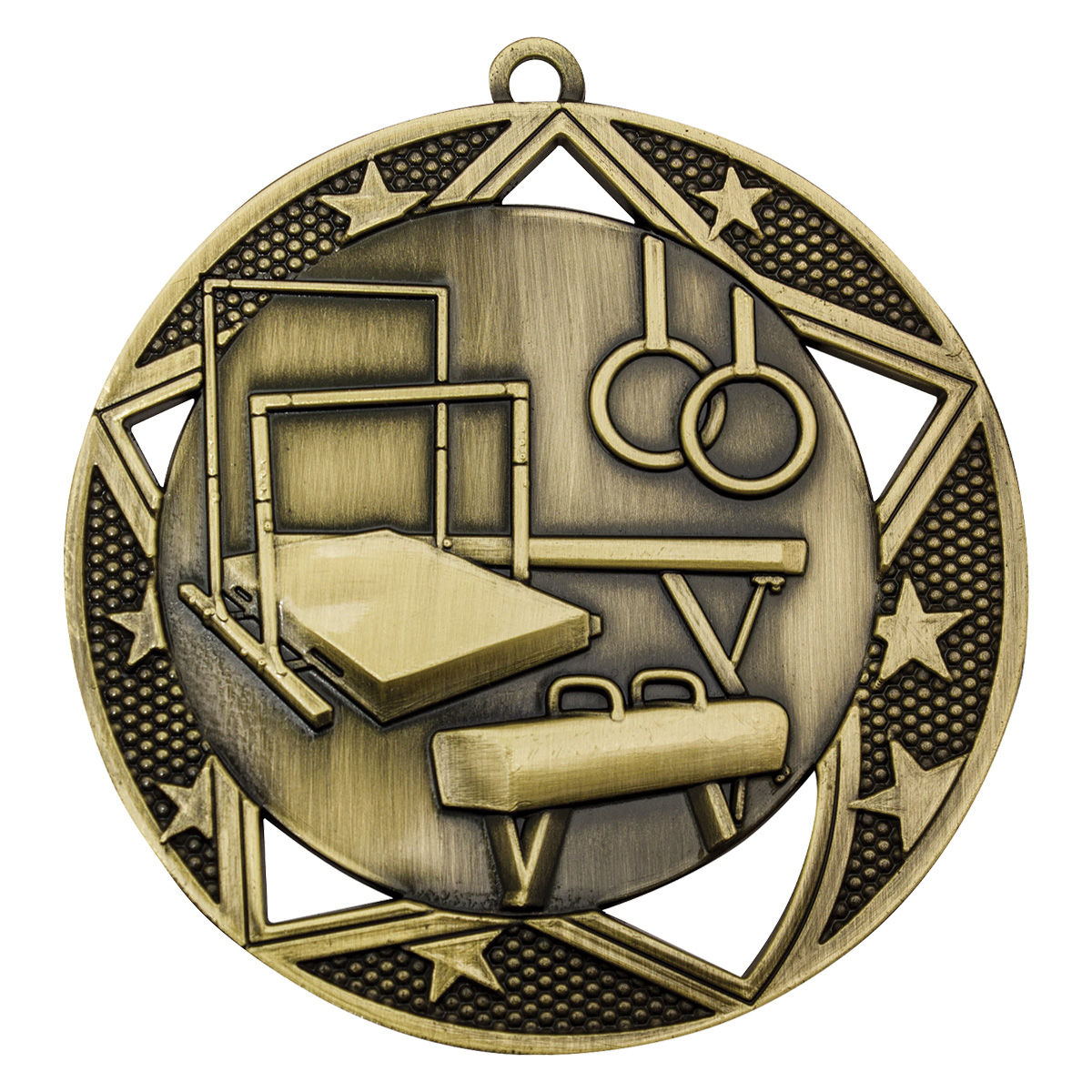 Galaxy Medals present a larger size of medal for Gymnastics with effective star design and is suitable for budget requirements. Available in gold, silver and bronze and ribbons and medal boxes to suit.