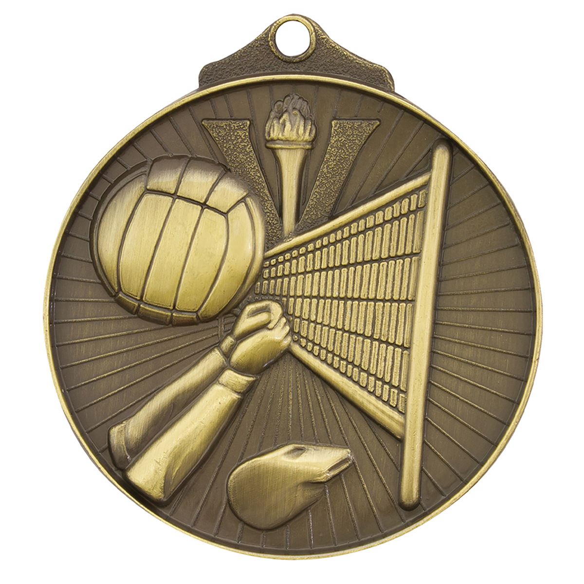 Antique gold, silver and bronze medals for Volleyball. A classic design, the Sunraysia Medals feature iconic Volleyball elements of the player’s hands, ball and net. Medals feature an extra thick edge and a rectangle panel on the back of the medal for your engraving.