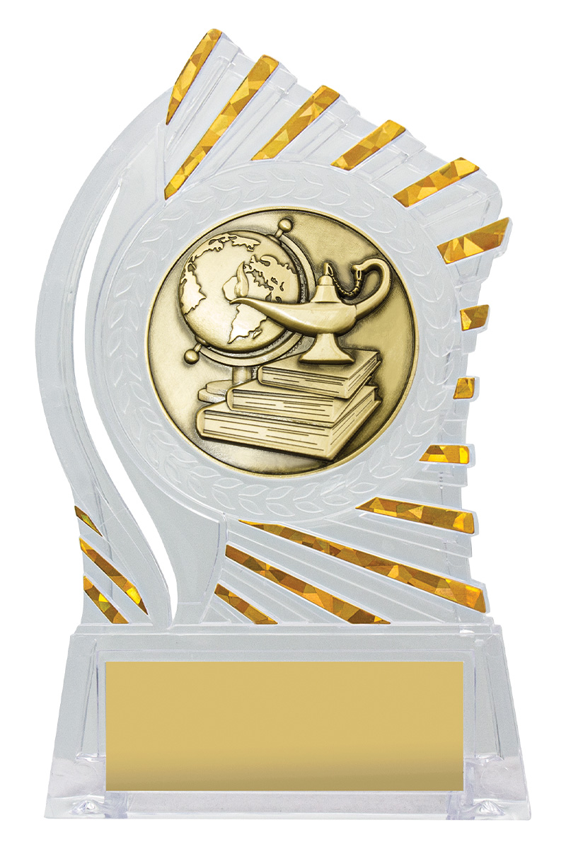 Exciting design of acrylic trophy showcases the gold theme for your sport or trophy. An affordable award with terrific space for your engraving.