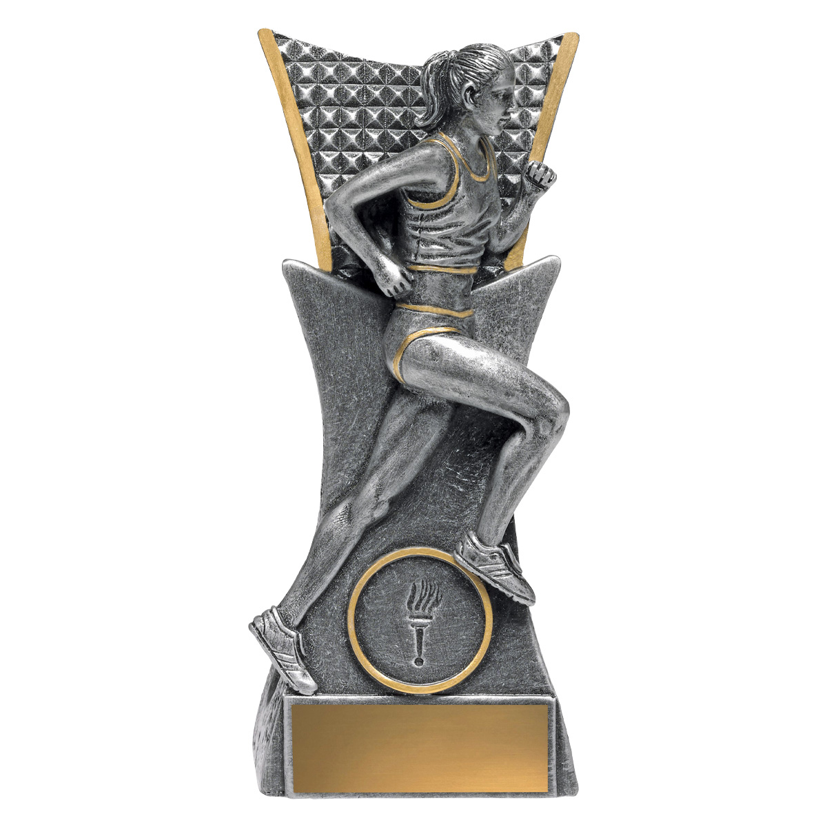 The Vanguard Trophy series, an innovative trophy design showcasing an athlete in motion. This track trophy is finished in silver & gold and available in 3 convenient and effective sizes.