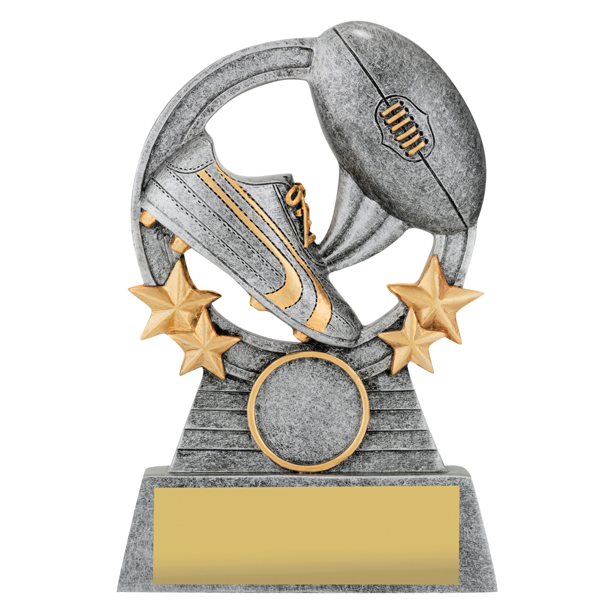 Comet series of footy trophies feature iconic boot & ball elements framed by an elegant star inspired design. With space for your logo, these trophies are perfect for your participation & club orders.