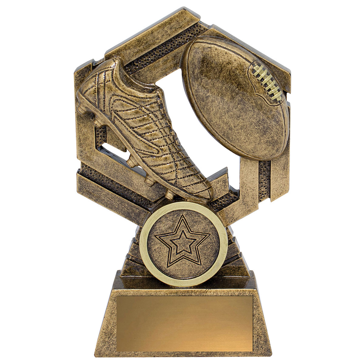 Eye-catching design that features classic Aussie Rules elements of boot and ball. Footy trophies finished in traditional antique gold. Available in 3 sizes with space for custom insert.