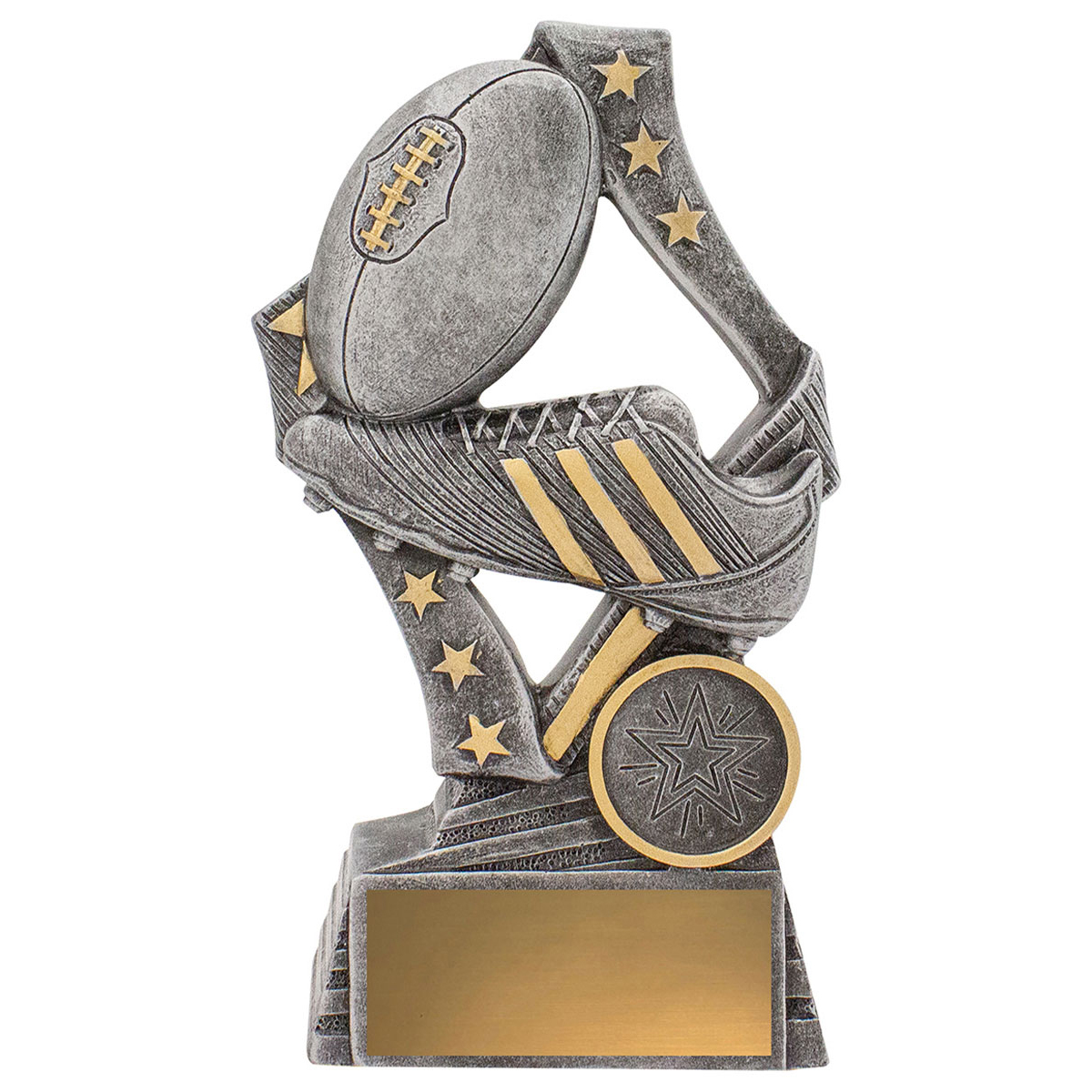 Dynamic footy trophies perfect for male and female players in your club. These ‘Flag’ aussie rules trophies feature a stylish star based design with iconic boot and ball elements.