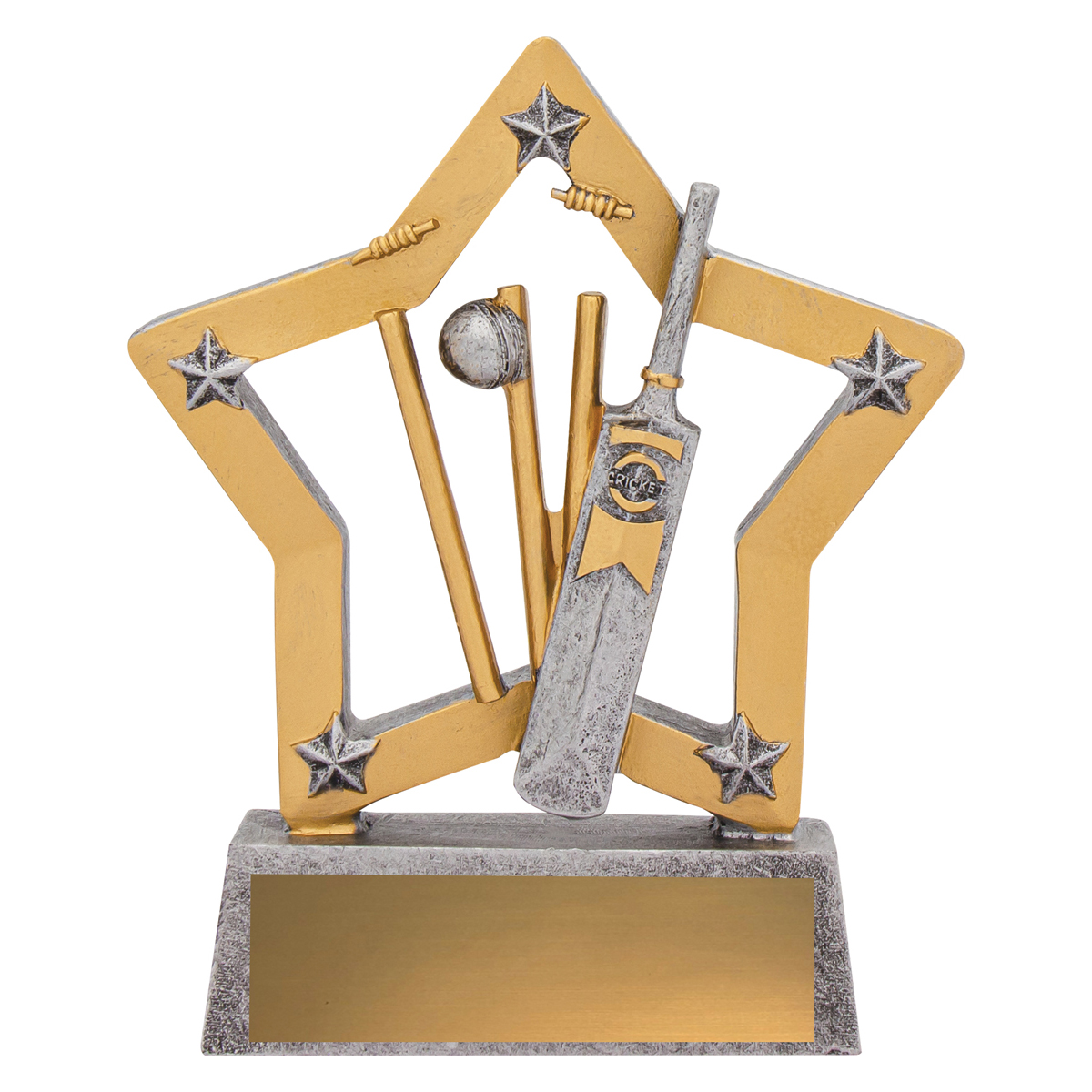 Affordable and popular Mini Star trophy for kids and players both male and female. An attractive star inspired design, classic silver and gold colours and at a budget price, well suited for cricket club and team orders.
