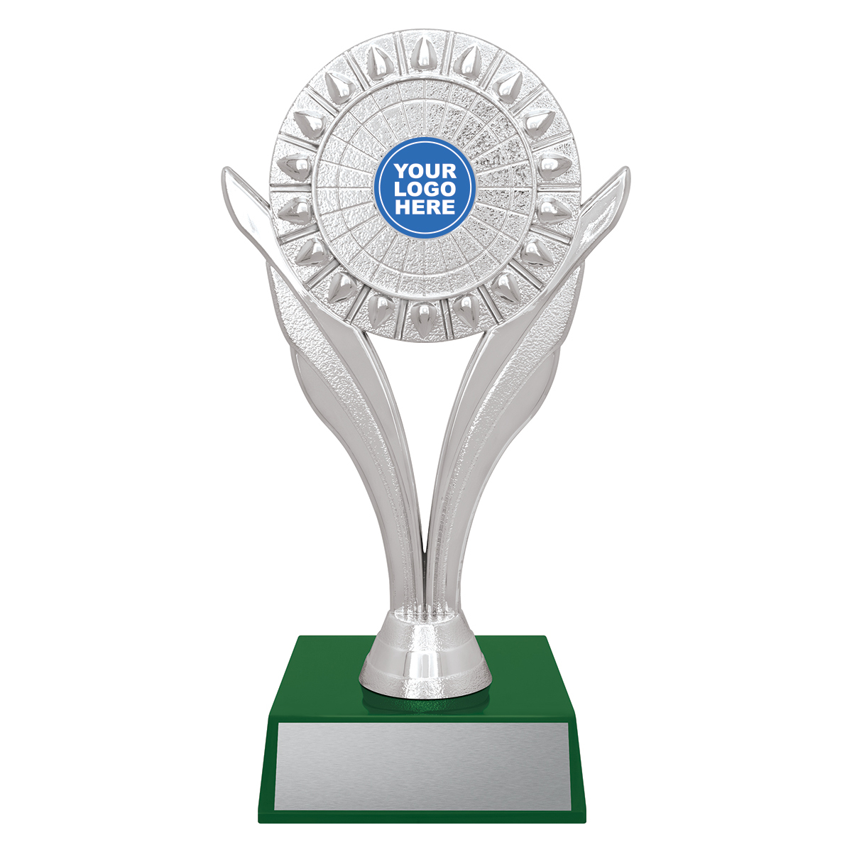 The Leaf series of holders finished in classic silver offer prime space for your custom logo. Pair with a base from the variety of colours available.