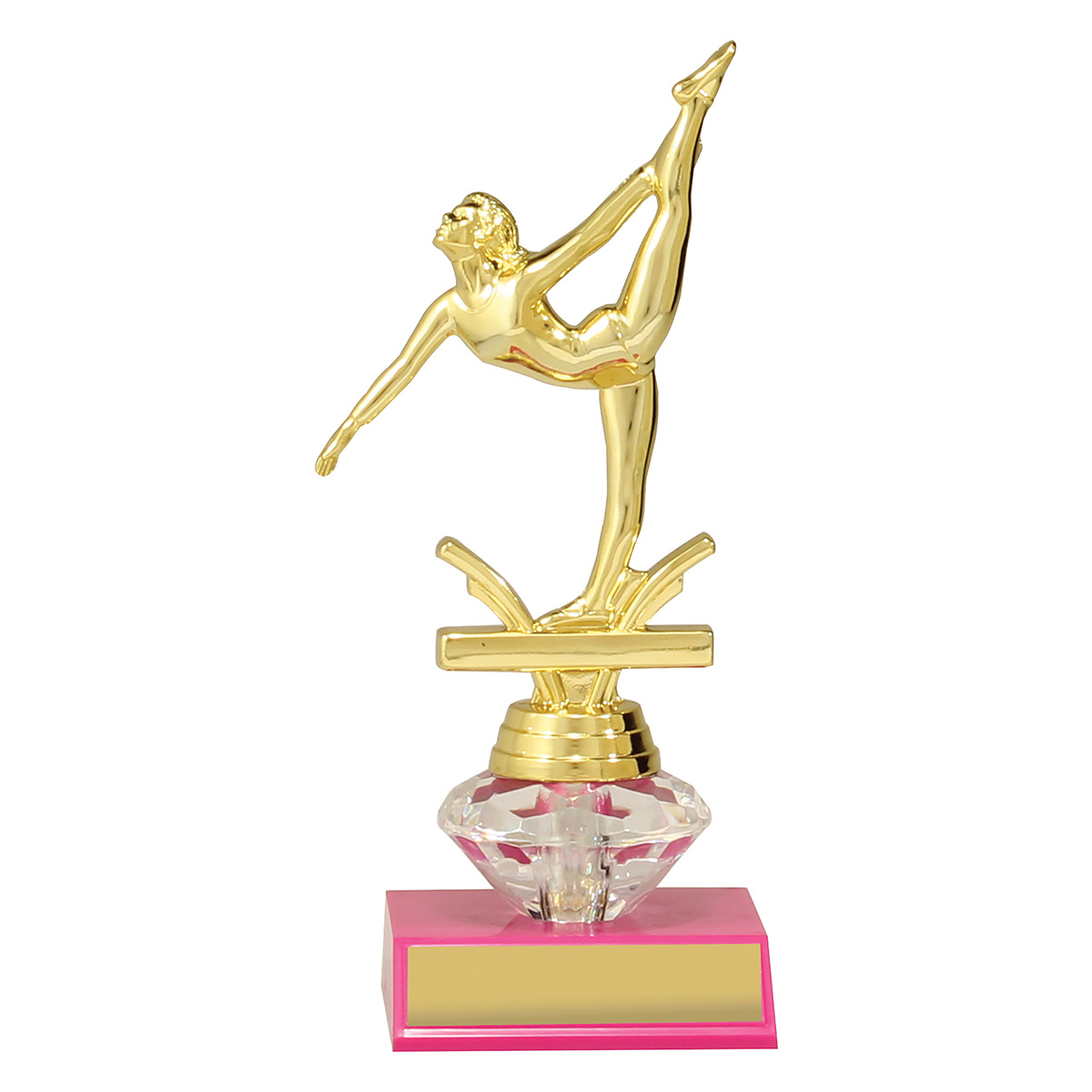 Stylish ‘diamond’ trophies ideal for dance and performing arts. With pink base and diamond riser, trophies are finished with bright gold dance figure.