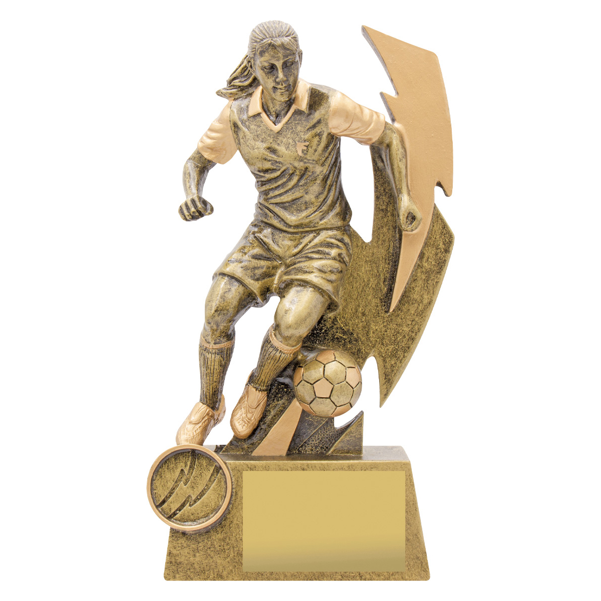 Football Shazam Trophy Series showcases a brilliant player – with excellent detail and completed in classic trophy gold colours. With 5 sizes, series of female football trophies perfect for your club award presentation.