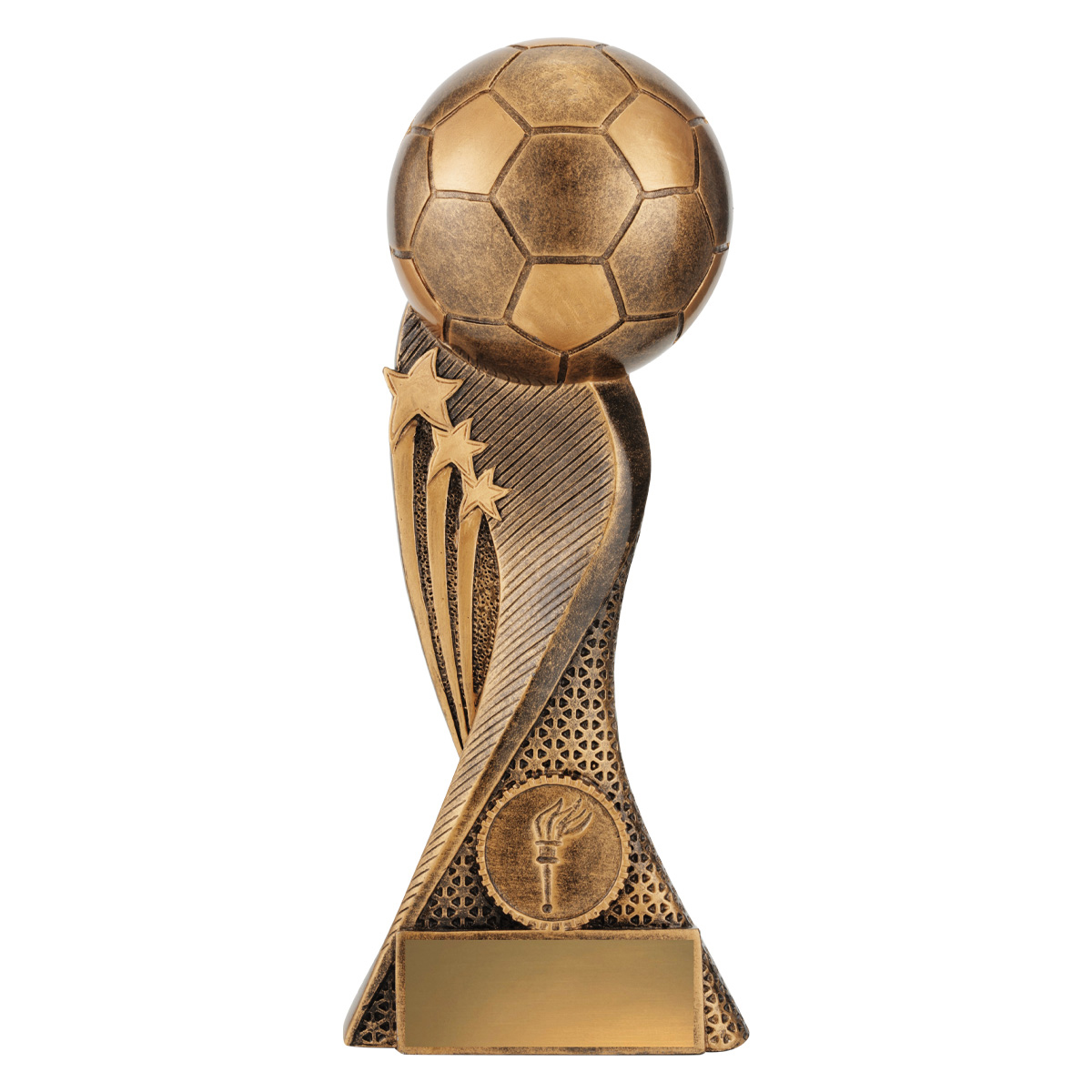 Truly impressive range of sizes for these soccer trophies – offering excellent options for budget participation, award recipients and premiership winners. Finished in traditional antique gold, the star inspired design celebrates the game with the prime, central position given to the football.