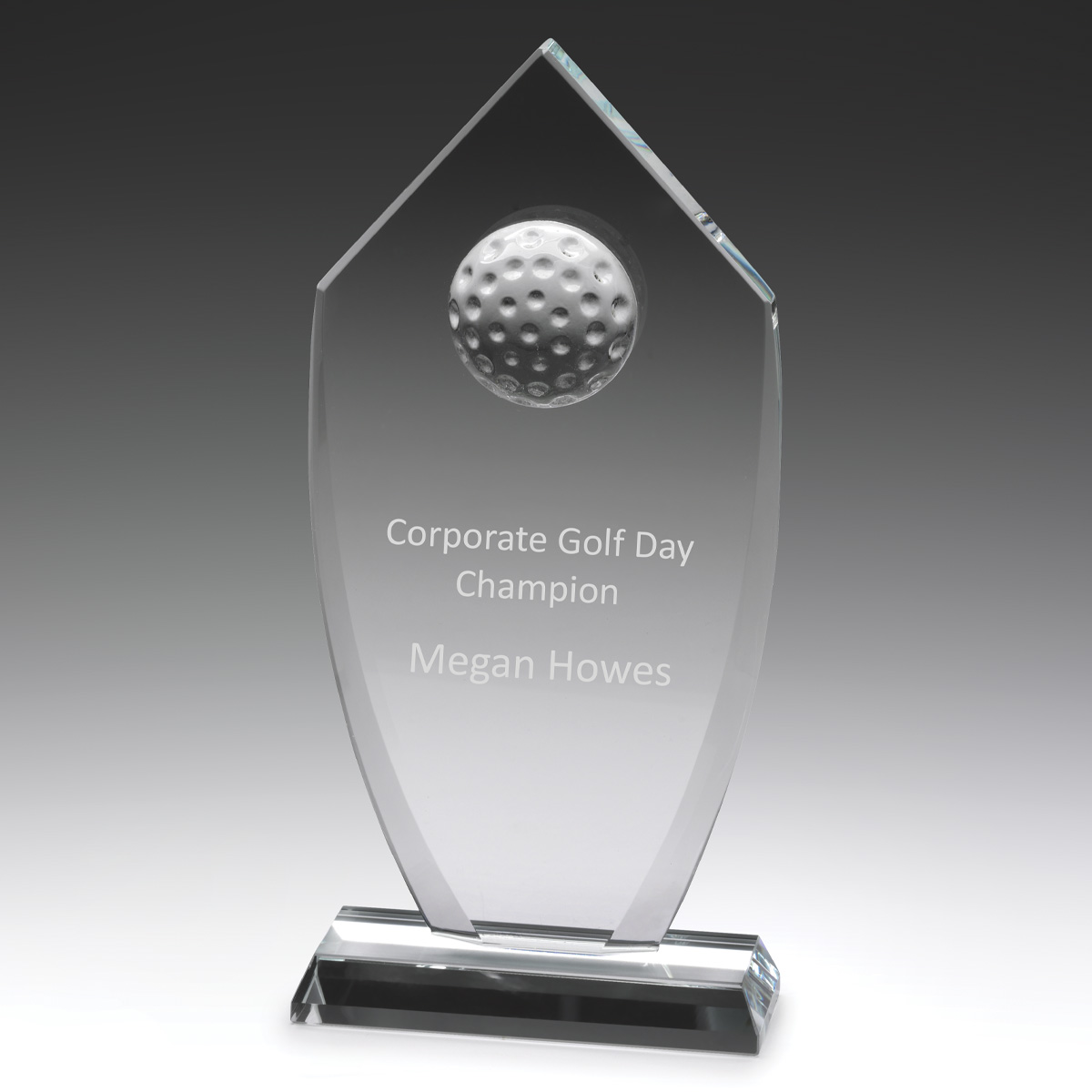 Affordable glass trophies in 2 sizes provide an effective award series for your golfing event or tournament. Awards feature quality clear glass – with detailed ball design – supplied in gift boxes.