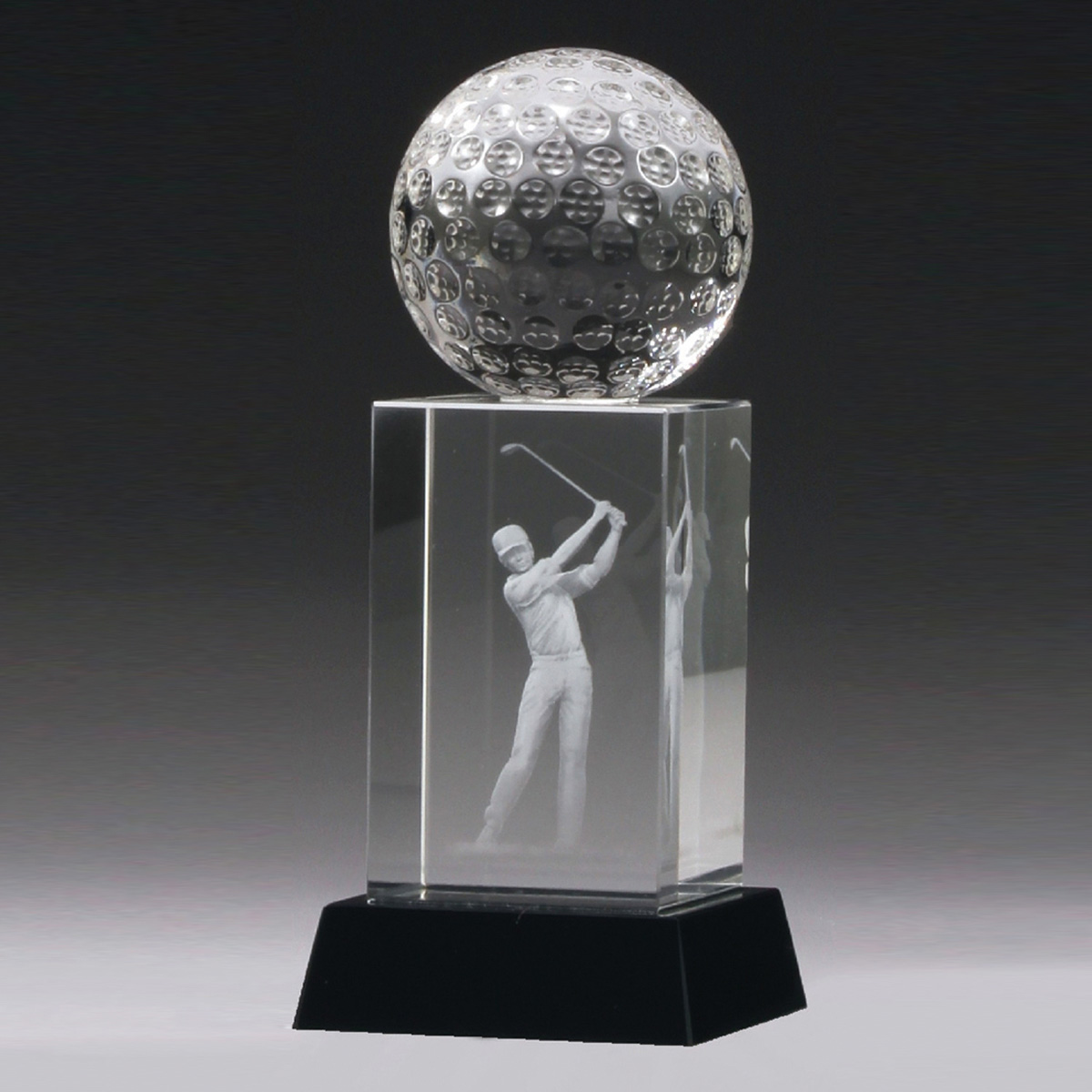Prestige golf trophy award suitable for various golfing events and competitions. The design features a precise 3D golf hologram, classic black base and detailed crystal golf ball.