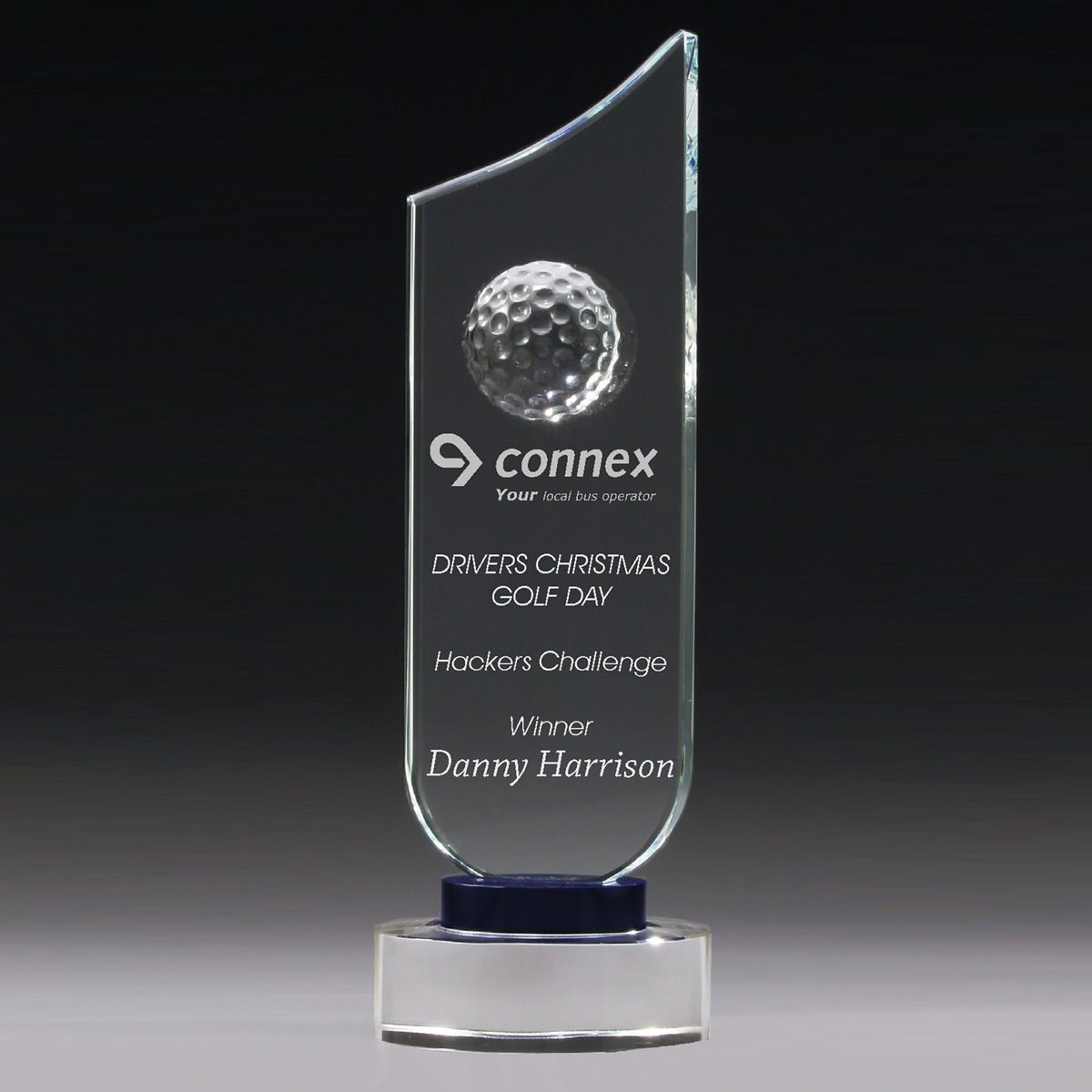 Golf Sabre Crystal award offers a prestige trophy option for your golf day or event, available in 3 sizes and supplied in gift presentation box. The design features a blue accent base and crystal golf ball decoration that elevates this award.