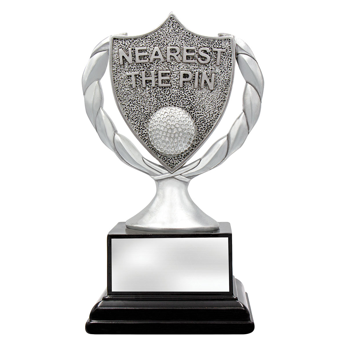 Wreath inspired trophy shield, this golf award finished in antique silver is perfect for your Nearest the Pin competition. Just one particular option in our vast golfing trophy range.
