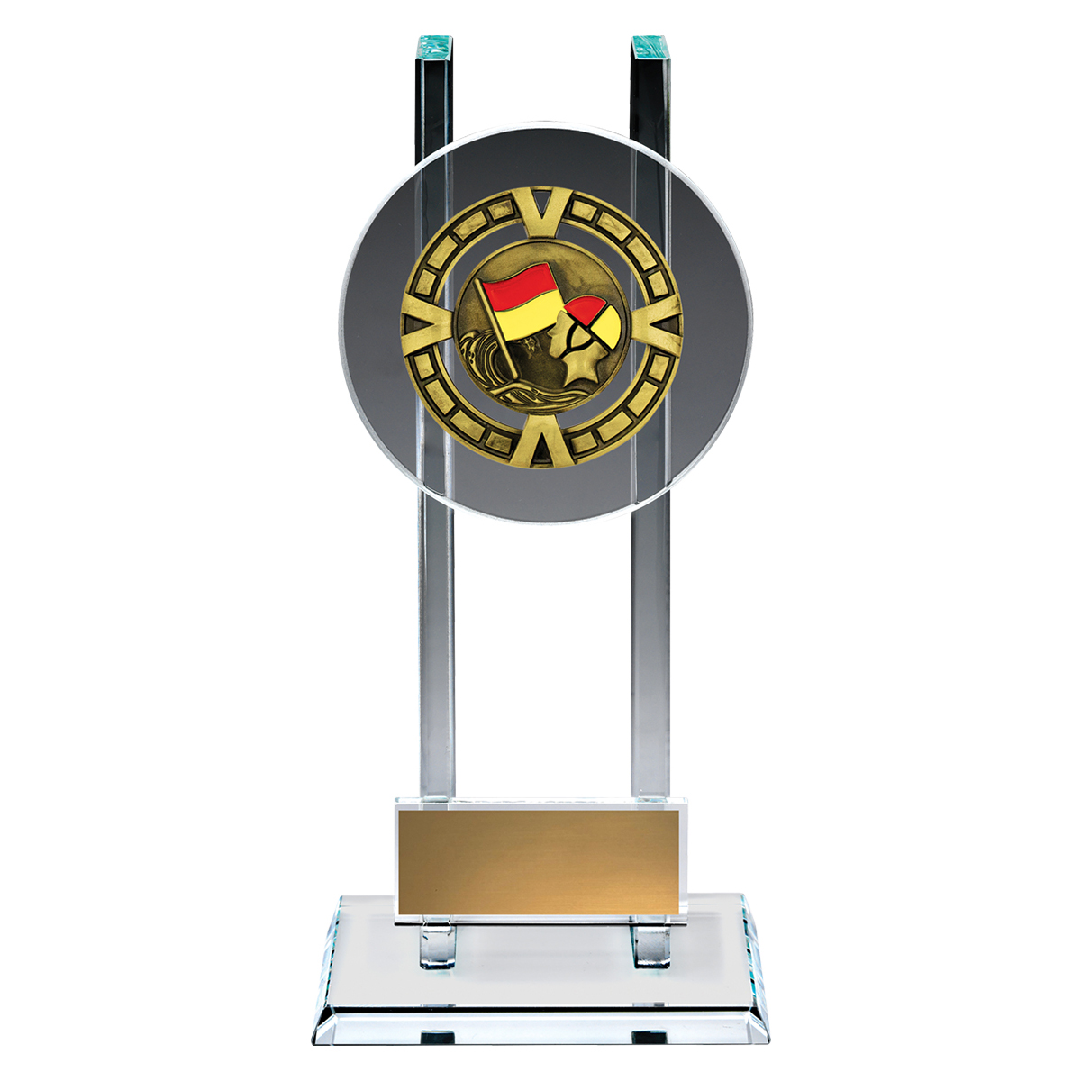 Bold glass awards are perfectly suited to recognise the top achievements at your team or club. Elevated glass platform showcases a brilliant metal theme for your sport or activity – space for your engraving as well.