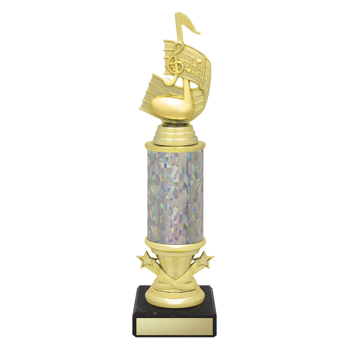 Outstanding series of music trophies feature star riser component and classic music note theme in shiny gold. Change colour of column to suit your awards.
