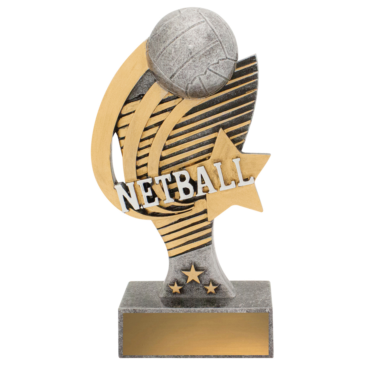 Striking design for your netball trophies – pair of sizes available – that feature a prominent rising ball element and finished in classic antique silver and gold colours.
