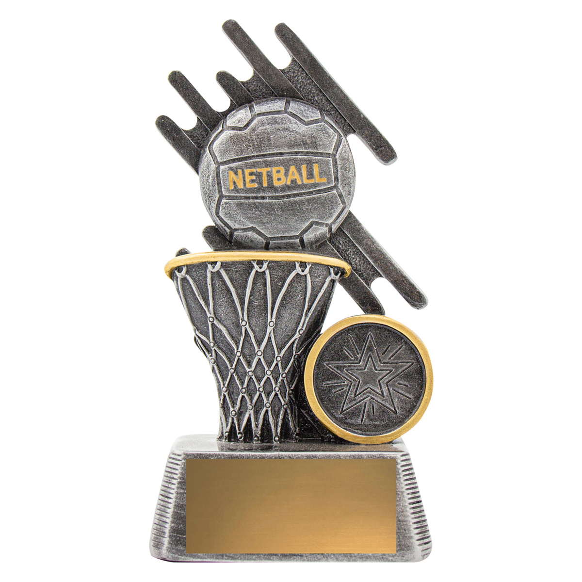 Zoom series of netball trophies celebrates iconic elements of the sport over multiple sizes – ideal for both participation awards and best playing awards.