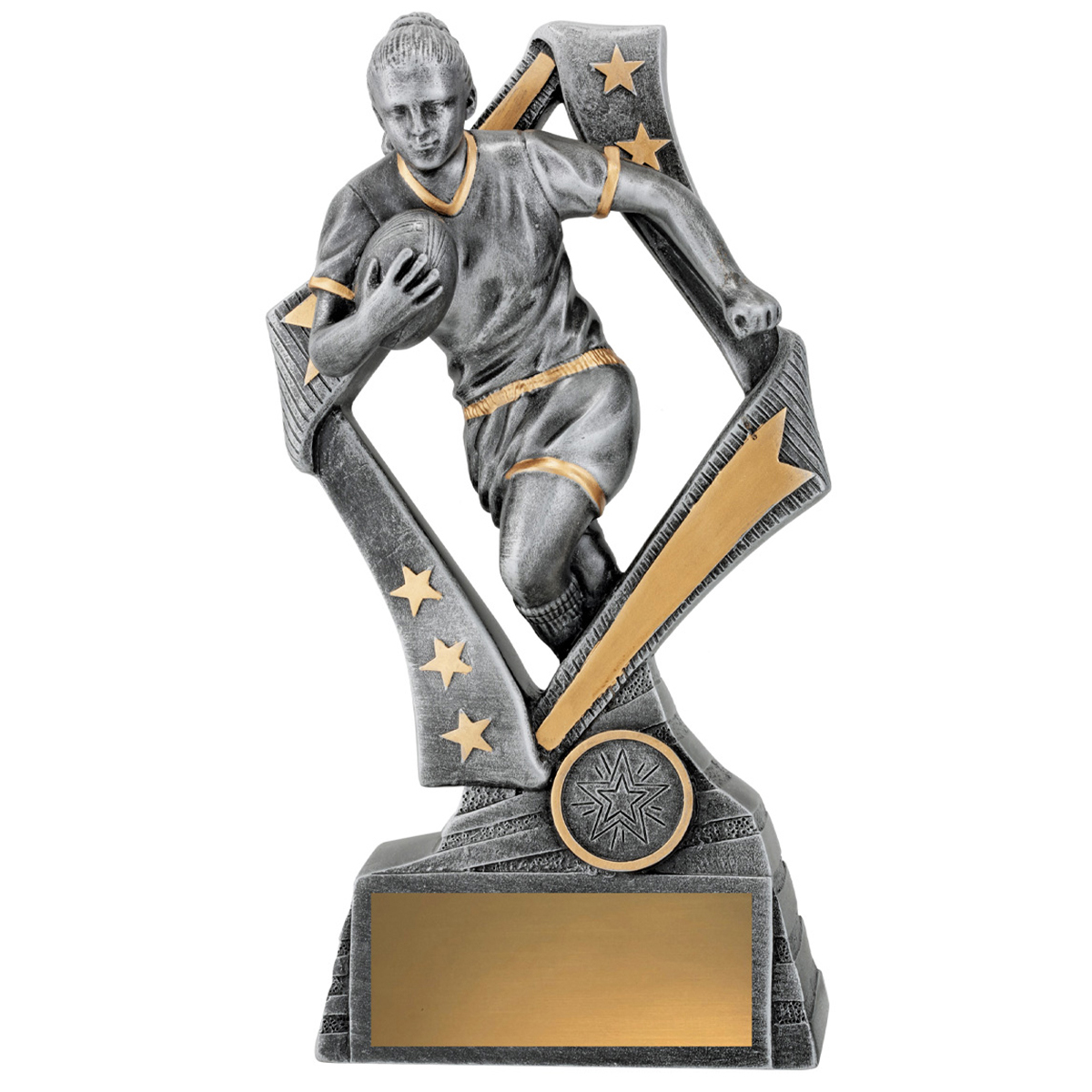 Dynamic rugby trophies feature female player in action framed by a stylish star inspired design and finished in classic antique silver and gold. Perfect for both league and union and for various award categories.
