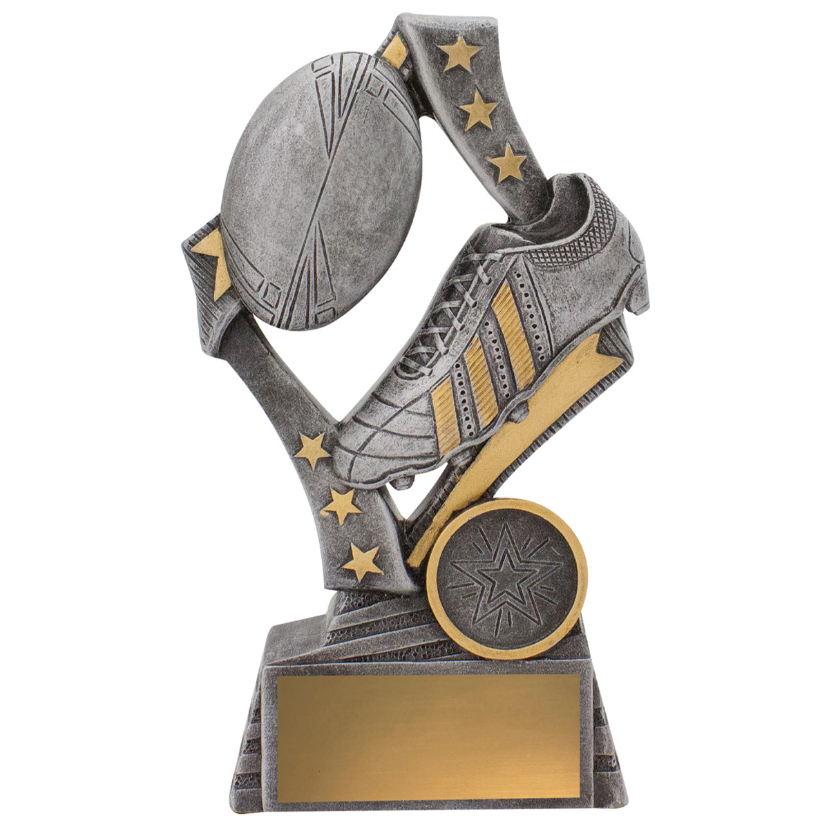 Dynamic rugby trophies perfect for league or union – for players of all ages, male and female. These ‘Flag’ trophies feature a stylish star based design with iconic boot and ball elements.