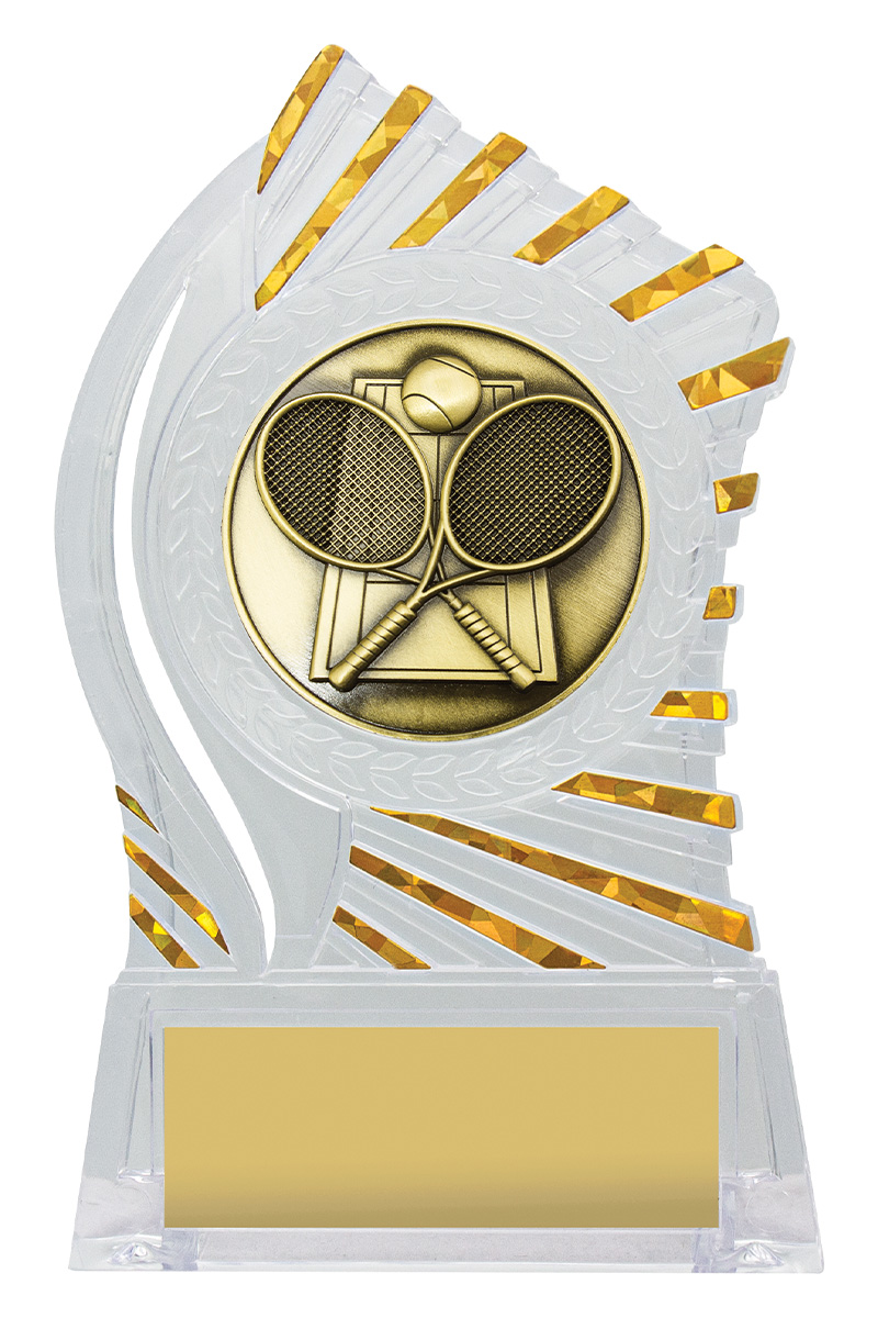 Exciting design of acrylic trophy showcases the gold theme for your sport or trophy. An affordable award with terrific space for your engraving.